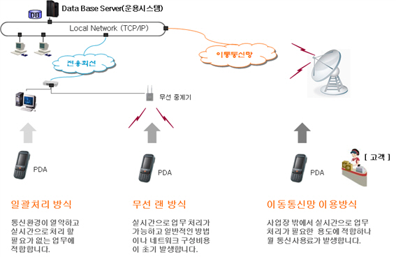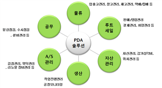 - 현장 판매/영업에 산업용 PDA를 이용하여 대고객 신뢰도 혁신과 실시간 재고관리 및 차량관리 등에 적용이 용이합니다.
